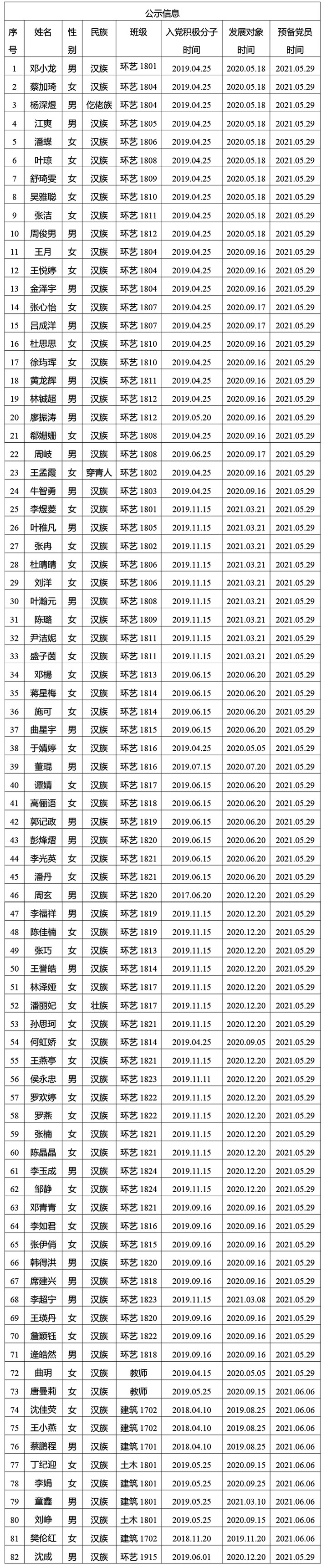 在征求党小组和党员、群众意见的基础上,经支部委员会审查,拟将邓小龙等82同志转为中共正式党员。根据发展党员工作有关要求,现将其有关情况公示如下,以下同志在预备期间表现良好。经党支部培养教育和考察,拟将邓小龙等82同志转为中共正式党员,并于近期召开支部大会讨论其转正问题。