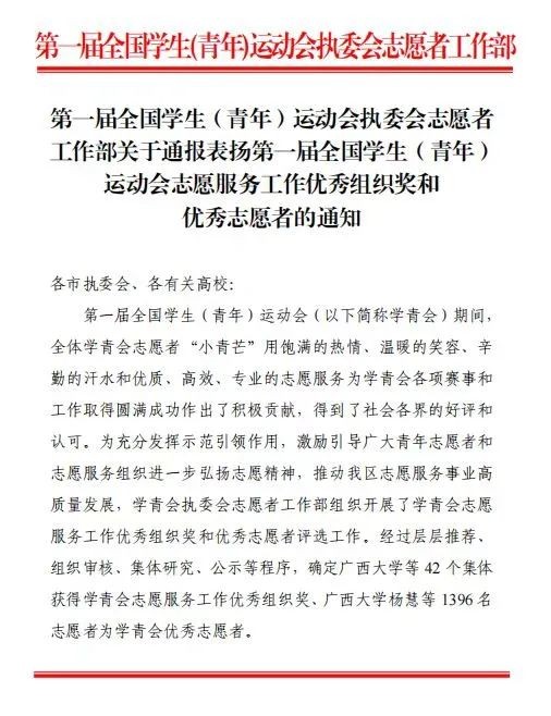 近期,第一届全国学生(青年)运动会执委会志愿者工作部下发《关于通报表扬第一届全国学生(青年)运动会志愿服务工作优秀组织奖和优秀志愿者的通知》,我校荣获学青会志愿服务工作优秀组织奖,并有11位同学荣获优秀志愿者。