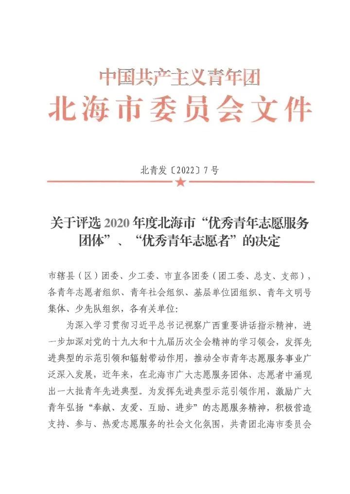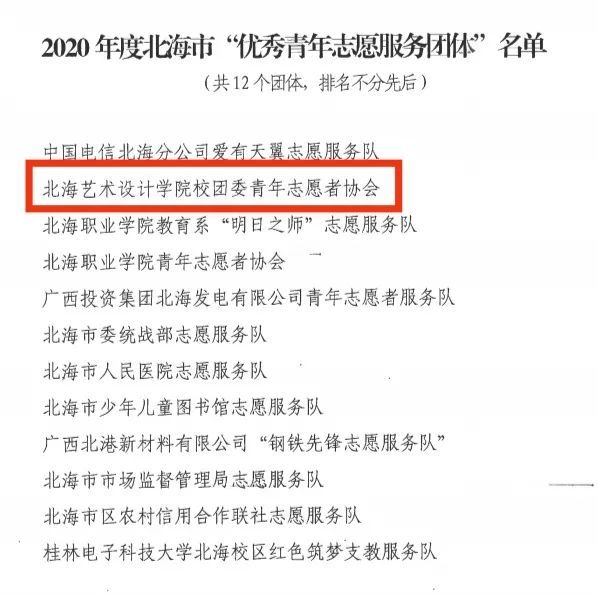 为发挥先进典型的示范引领作用,激励广大青年弘扬“奉献、友爱、互助、进步”的志愿服务精神,积极营造支持、参与、热爱志愿服务的社会文化氛围,共青团北海市委员会决定评选北海艺术设计学院青年志愿者协会等12个志愿团体为2020年度北海市“优秀青年志愿服务团体”,沈星宇等20名志愿者为2020年度北海市“优秀青年志愿者”。