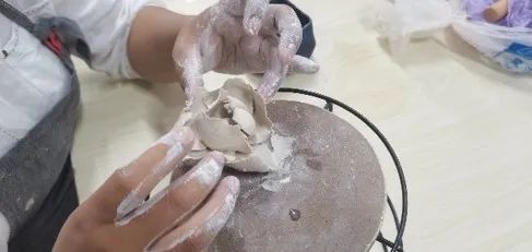 (学生在运用广西高岭土体验瓷花制作)