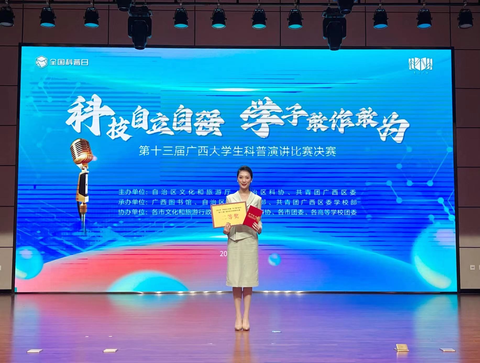 近日,由自治区文化和旅游厅、自治区科协、共青团广西区委共同主办的第十三届广西大学生科普演讲比赛决赛在南宁举行。我校动画与传媒学院播音与主持艺术专业2101班的赵晨希同学代表北海市参赛,凭借出色的表现,荣获了二等奖的佳绩。赵晨希同学的指导老师李超也因其卓越的辅导工作,荣获了“优秀指导教师”的荣誉称号。
