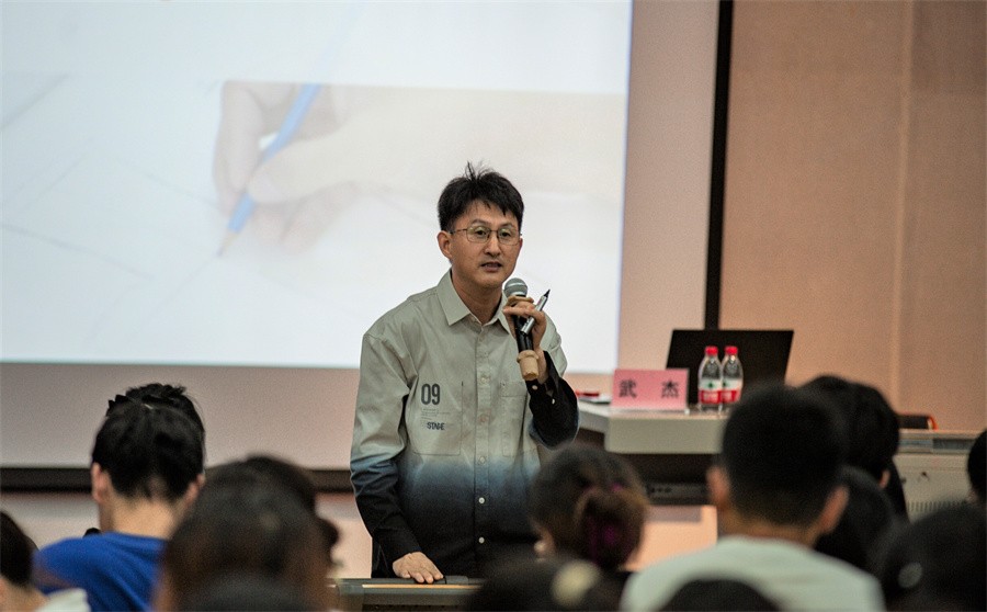 讲座开始,武杰院长播放其参与设计的片头广告《心有多大,舞台有多大》,引出当下设计行业的设计实践与就业方向以及特色小镇全案实施路径、乡村振兴产业融合发展模式。武杰院长以问答的方式带领大家进入对专业更深层次的思考,他从对自身专业的理解和发展方向的思考两个方面与现场学生进行互动,面对同学们提出的疑问,他通过分享自身经验提供想法,并且在传授经验之时,强调设计要具有差异性、唯一性才能有生命力,鼓励大家在设计方面敢想敢做,培养独特的个人风格。