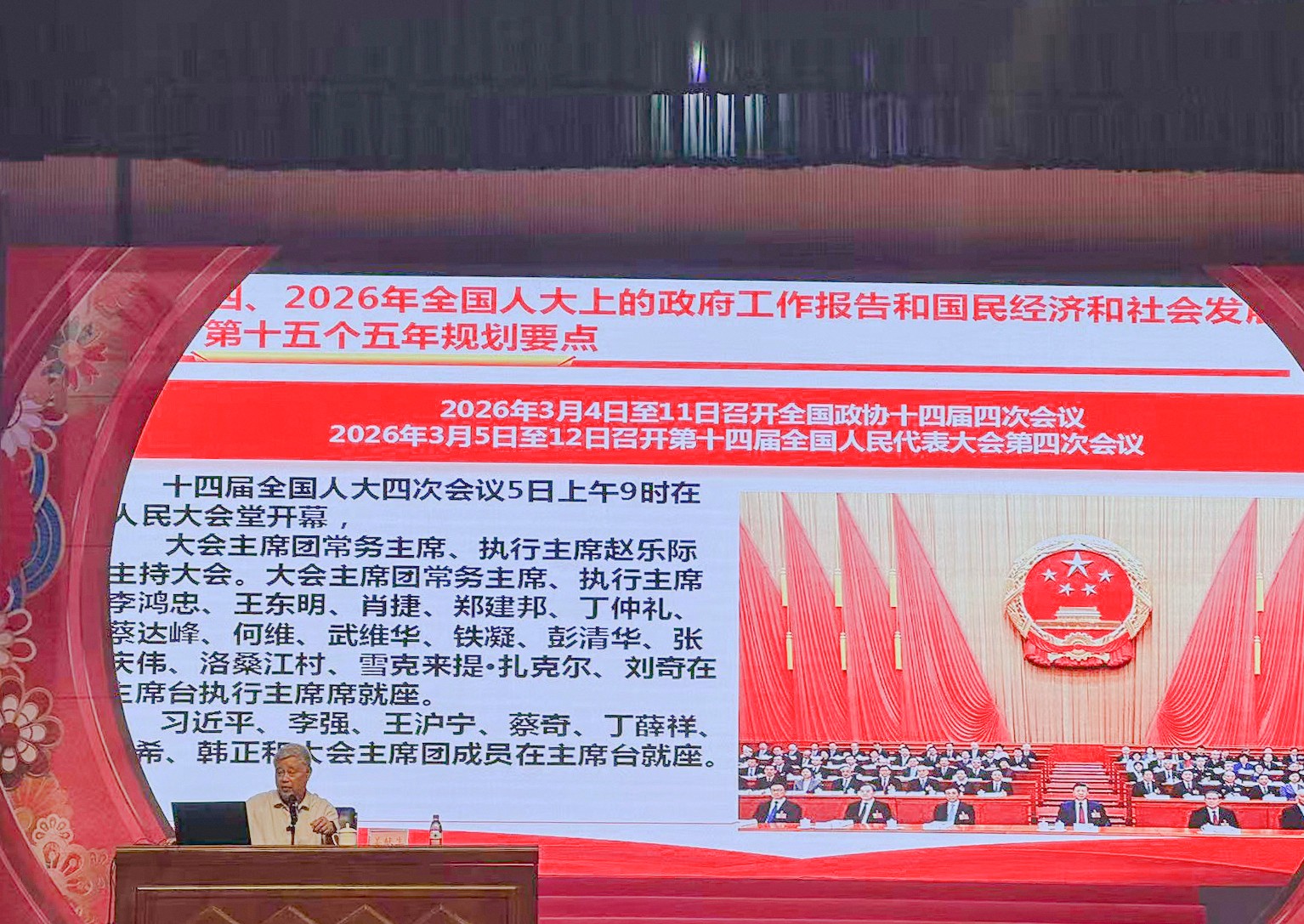 宣讲中,我院院长姜献生教授紧扣党的二十届四中全会精神核心要义,系统解读了党的二十届四中全会通过的《中共中央关于制定国民经济和社会发展第十五个五年规划的建议》精神和第十四届全国人民代表大会第四次会议通过的《中华人民共和国国民经济和社会发展第十五个五年规划纲要》精神以及国务院总理李强在第十四届全国人民代表大会第四次会议上所作的政府工作报告,并结合老年大学的实际,重点介绍了三个文件中与老年人有关的内容。讲课的最后,他提出,老年人应该主动响应党和政府的号召,为新时代中国特色社会主义社会的稳定、繁荣、发展发挥余热,在党和政府的关爱下实现老有所养、老有所学、老有所为、老有所乐。