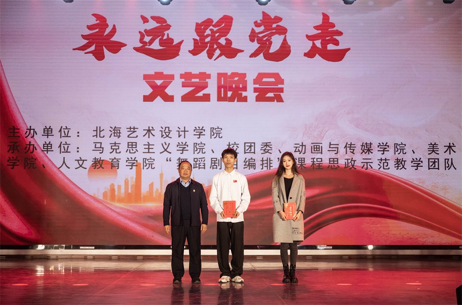 冬日的暖阳照耀北艺,和煦的暖风扬起旗帜。12月26日晚,我校在西校区大礼堂举办“永远跟党走”文艺晚会。晚会由北海艺术设计学院主办,马克思主义学院、校团委、动画与传媒学院、美术学院、人文教育学院“舞蹈剧目编排”课程思政示范教学团队联合承办。学校党委书记范徽忠,副校长陶立阳,马克思主义学院院长姜献生,校团委书记唐良春,人文教育学院党总支书记、院长熊秀峰等出席晚会。同时,本次晚会面向全体党员、发展对象和积极分子。
