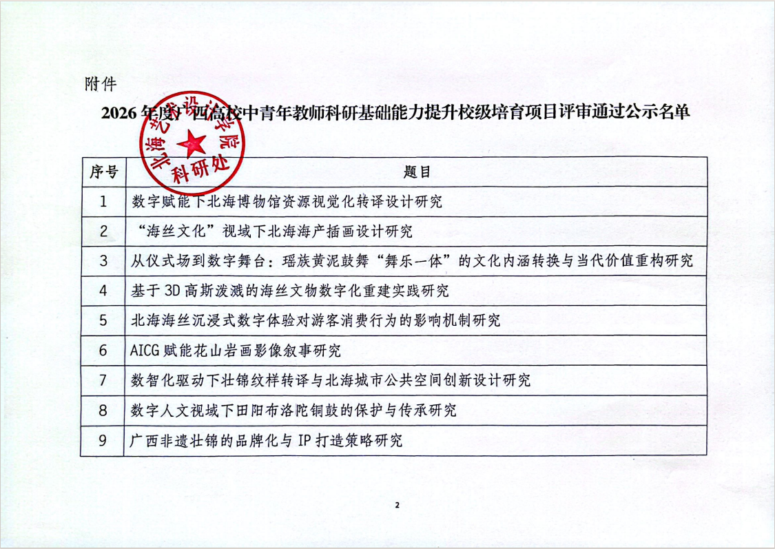 根据北艺科研〔2025〕30号《关于组织申报2026年度广西高校中青年教师科研基础能力提升培育项目的通知》的文件要求,我校积极组织申报。经个人申请、二级学院报送,由科研处负责项目筛查、人事部门负责申报人信息复核、校外专家函评、学校学术委员会专家评审与评议,现确定《数字赋能下北海博物馆资源视觉化转译设计研究》等40个项目通过本次项目评审,现将评审结果予以公示(详情见附件)。