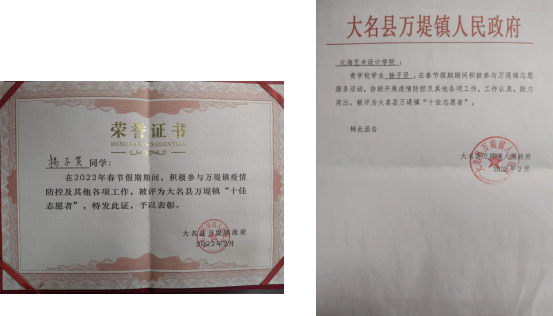 2022年2月,疫情形势变得严峻起来,而这个时候正值春运,疫情防控面临的任务更加繁重艰巨。杨子贤同学响应当地政府号召,主动加入志愿者队伍,积极参与当地疫情防控工作。在工作期间,认真负责,能力突出,协助有关部门完成各项任务,被当地政府评为“十佳志愿者”荣誉称号。