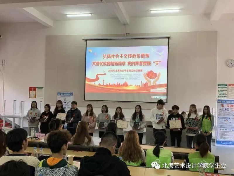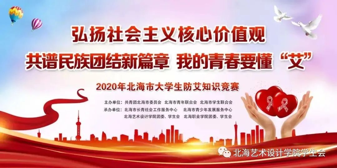 11月29日上午,由共青团北海市委员会、北海市青年联合会、北海市学生联合会主办,北海市长青社会工作服务中心、北海市青少年发展服务中心、北海艺术设计学院团委、学生会、北海职业学院团委、学生会共同承办的“弘扬社会主义核心价值观 共谱民族团结新篇章”我的青春要懂“艾”——2020年北海市大学生防艾知识竞赛活动在我校举行。来自北海职业学院及北海艺术设计学院的6支高校学生队伍参与竞赛,100余名大学生现场观赛。