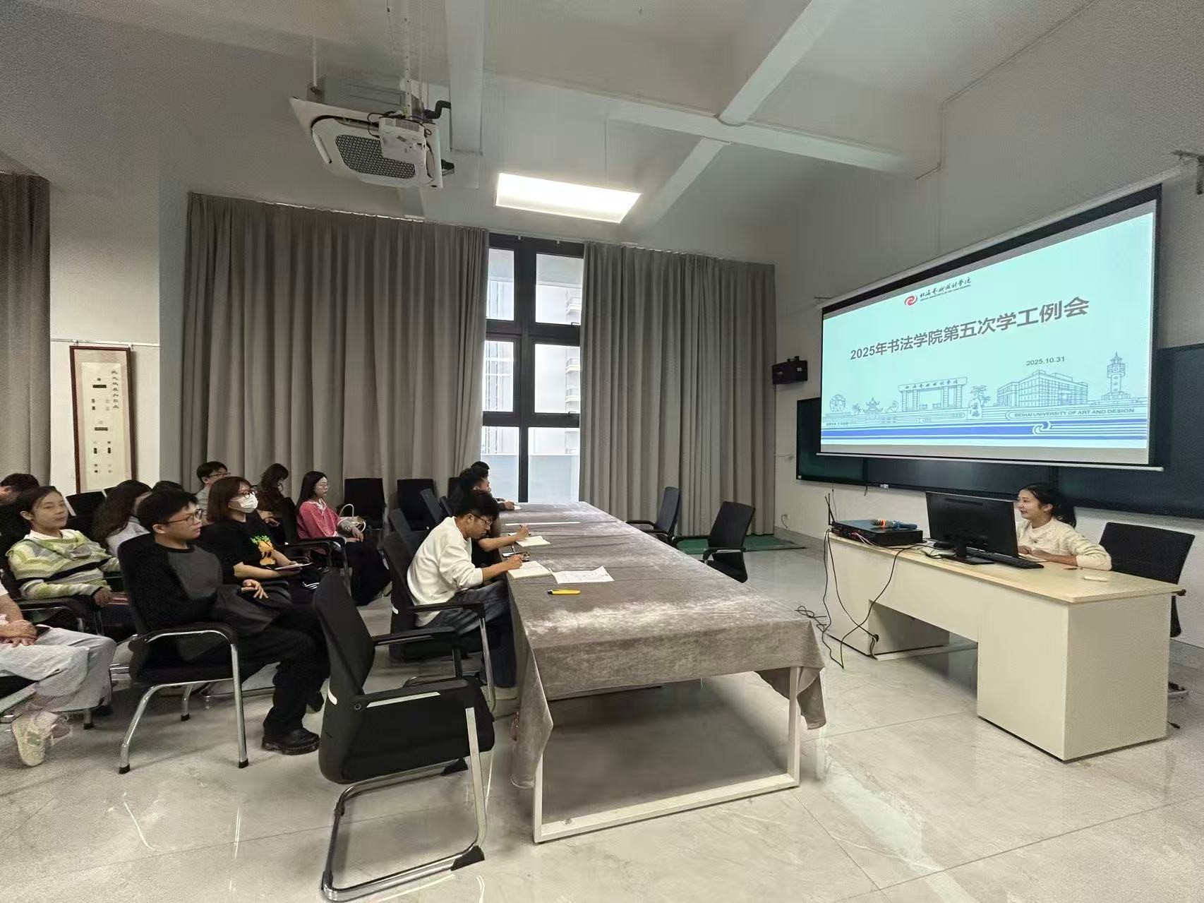 10月31日下午,书法学院学工办在艺德楼507书法学教研室组织召开了第五次学生工作会议。学院党支部书记喻广林、副书记左云飞分管学工副院长李家琪、黄荣婷、韦志忍,以及全体学工教师与辅导员共同参会。会议由学工办主任胡慧捷主持。