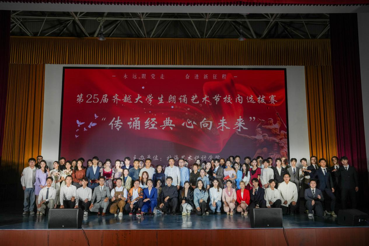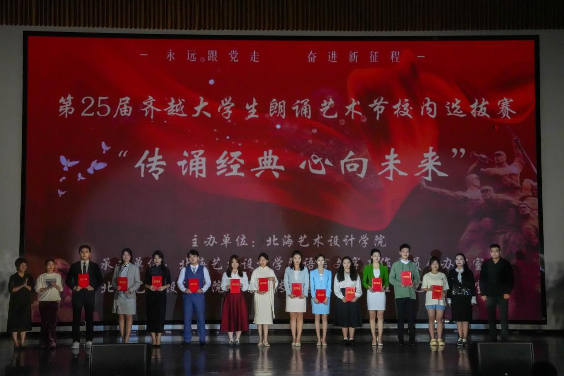 近日,“传诵经典 心向未来” 第二十五届齐越朗诵艺术节北海艺术设计学院选拔赛在西校区大礼堂圆满落幕。本次比赛由北海艺术设计学院主办,学校语言文字工作委员会办公室和动画与传媒学院播音与主持艺术教研室共同承办,学校副校长陶立阳、包建明,教务处处长武鹏程,动画与传媒学院党总支书记张帆,院长孙永辉,党总支副书记黄强红等学院领导出席本次大赛。
