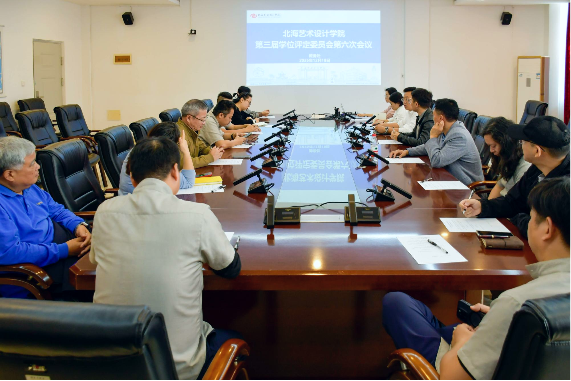 2025年12月18日,我校在行政楼212召开北海艺术设计学院第三届学位评定委员会第六次会议,审议新增学士学位授予专业授权申请及2025年12月学士学位授予事宜。学位评定委员会共14人出席会议,教务处及二级学院相关负责人参加会议。
