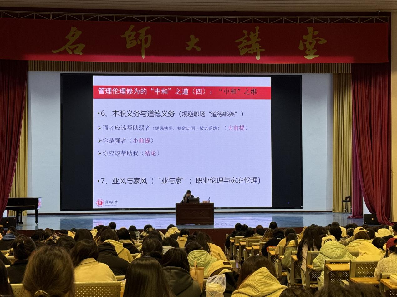 12月18日晚,广西大学公共管理学院王玉生教授应邀于我校西校区大礼堂,为广大师生带来了一场题为《管理伦理修为中的“中和”之道》的精彩讲座。讲座旨在分享管理中的“中和”哲学思想以及人生需要掌握的协调平衡思维。讲座由院长蒙绍荣教授主持。