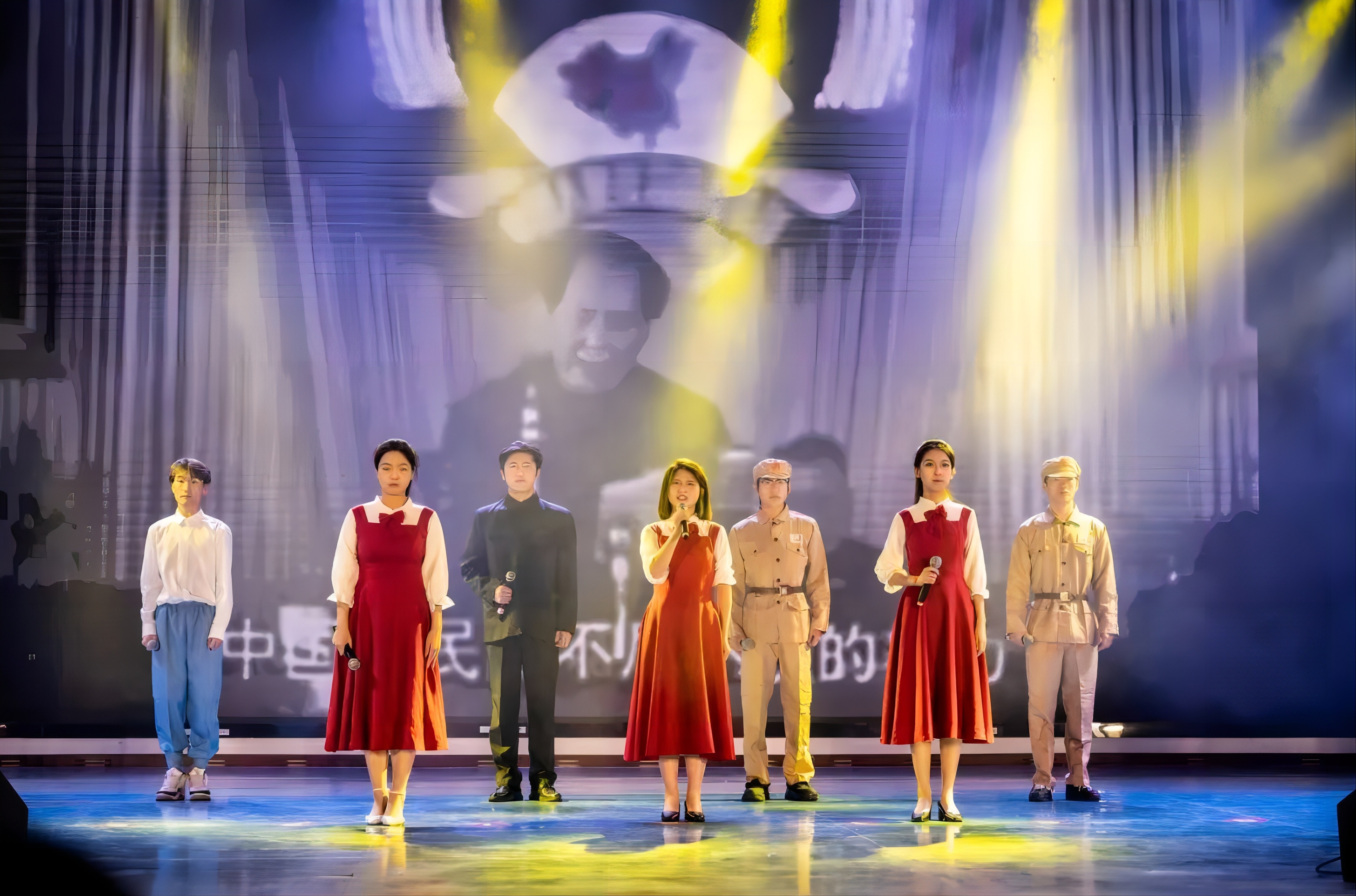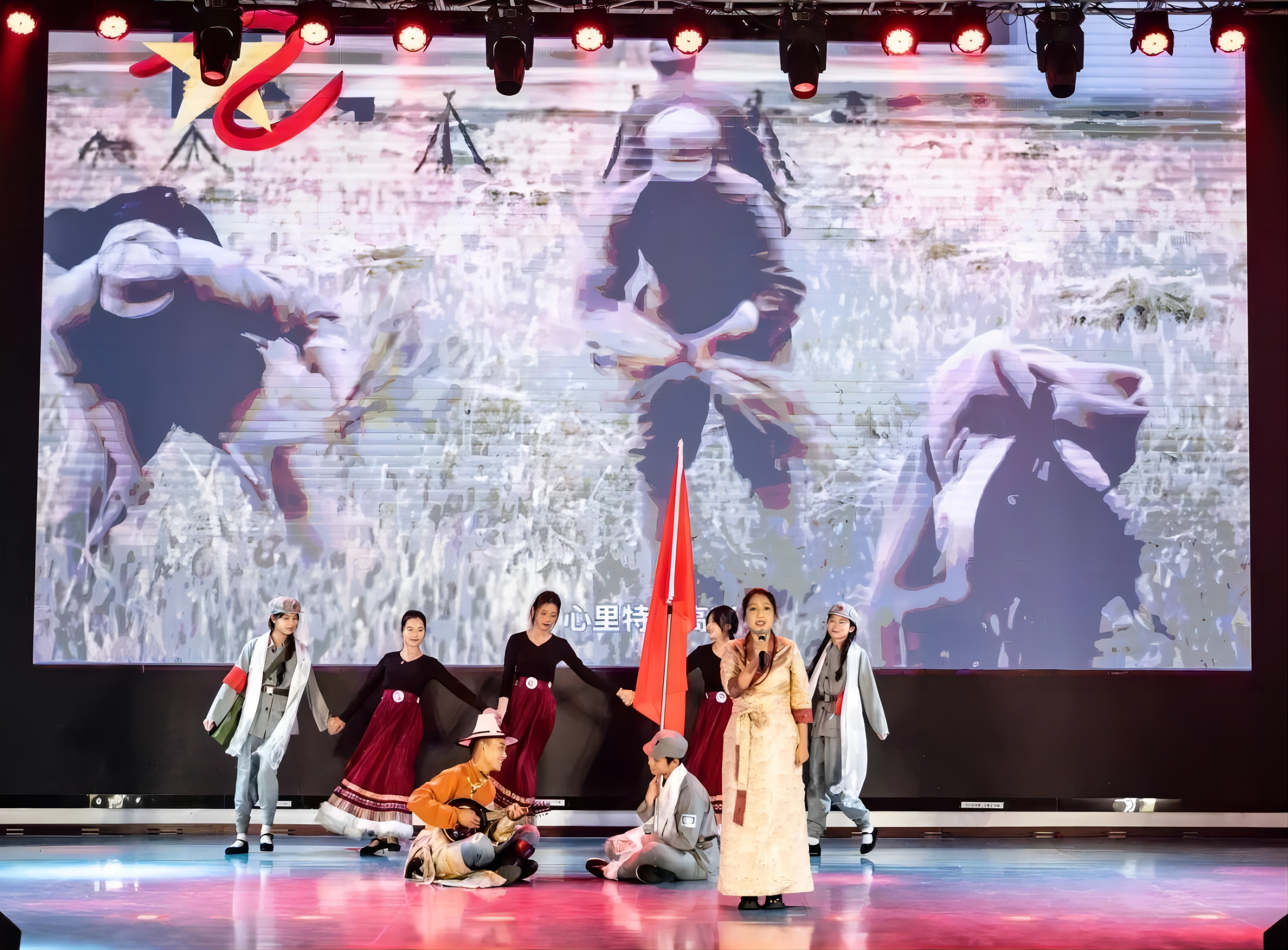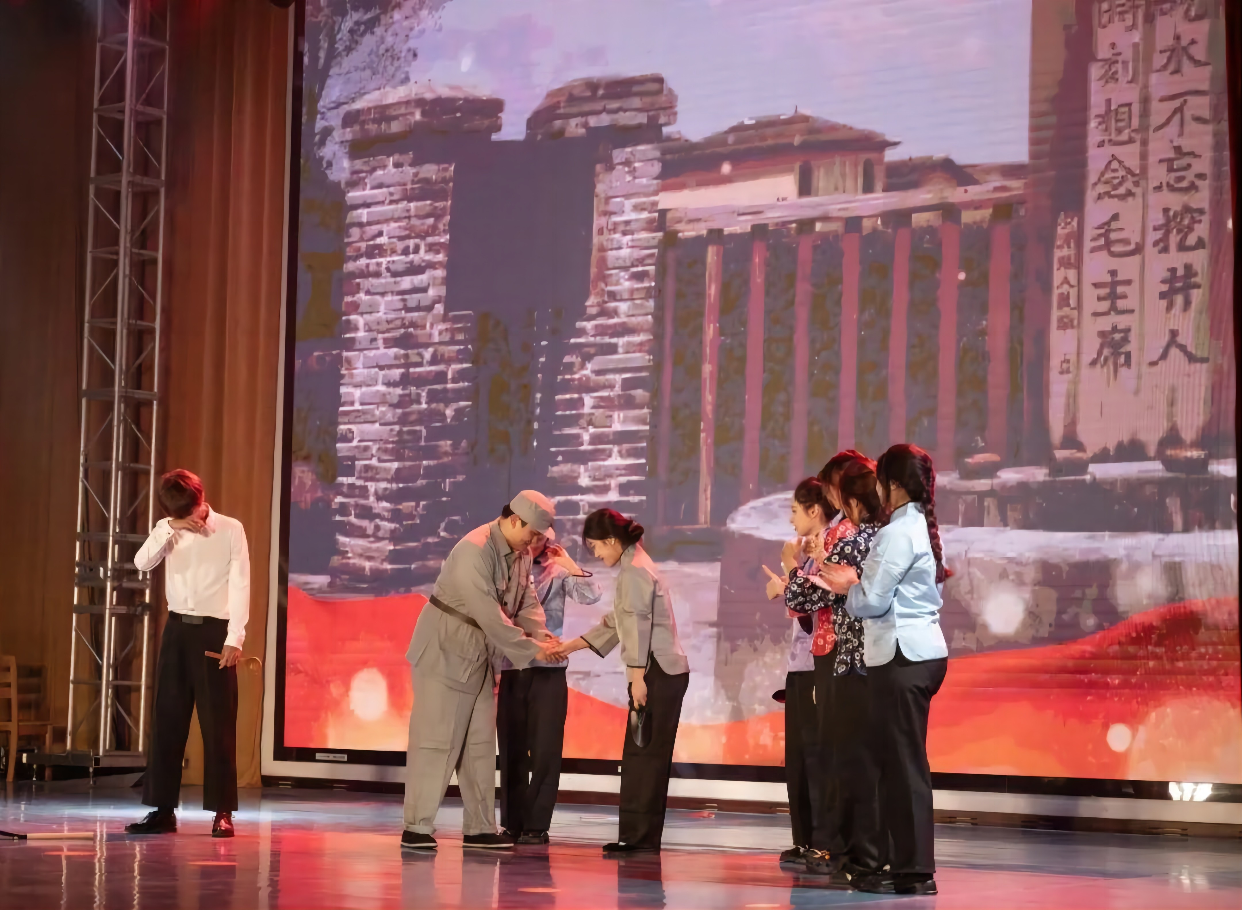 随后,由校合唱团带来的合唱《太行山上》余音绕梁,结合现场书法气势恢宏,台下观众情绪随着旋律此起彼伏;舞台剧《红绸》用艺术的方式讲述了中国共产党诞生的故事,现场热血激昂;舞蹈《风筝》《雨花石的等待》《离开雷锋的日子》《永不消逝的花》用不同的舞蹈风格,展现了永远跟党走的决心和对革命历史故事感悟;群体诗朗诵《沁园春·长沙/沁园春·雪》《为有牺牲多壮志》铿锵有力,用声音传递伟大革命思想;朗诵《毛主席的光辉照万代》体现了民族大团结,同心同向在学习伟人的光辉历程中不断前进。