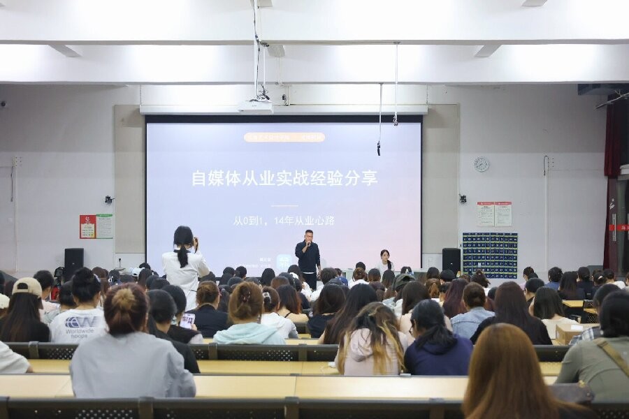 实战赋能,多元引路,本次讲座核心分享环节,两位行业资深嘉宾结合自身创业经历与领域经验,为学生带来干货满满、贴合专业的实战分享。 北海市青年创业促进会理事、副秘书长、创业导师、北海阿叔文化传媒有限责任公司总经理姚礼泉,深耕本地新媒体行业多年,拥有丰富的创业运营与行业洞察经验。他以自身创业历程为切入点,全面分析当前新媒体行业的发展趋势、机遇挑战与人才需求,重点围绕舞蹈专业与新媒体融合发展展开深度分享,详细讲解舞蹈学生如何借助短视频、直播、新媒体运营等渠道实现跨界就业与创业,为大家打开舞蹈专业跨界发展的全新视野,提供可落地、可参考的创就业新路径。