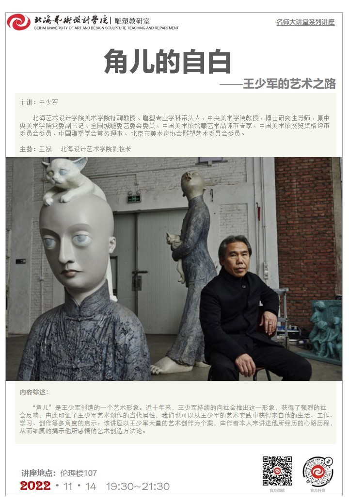 2022年11月14日,北海艺术设计学院美术学院名师大讲堂系列讲座《角儿的自白——王少军的艺术之路》在伦理楼举行。