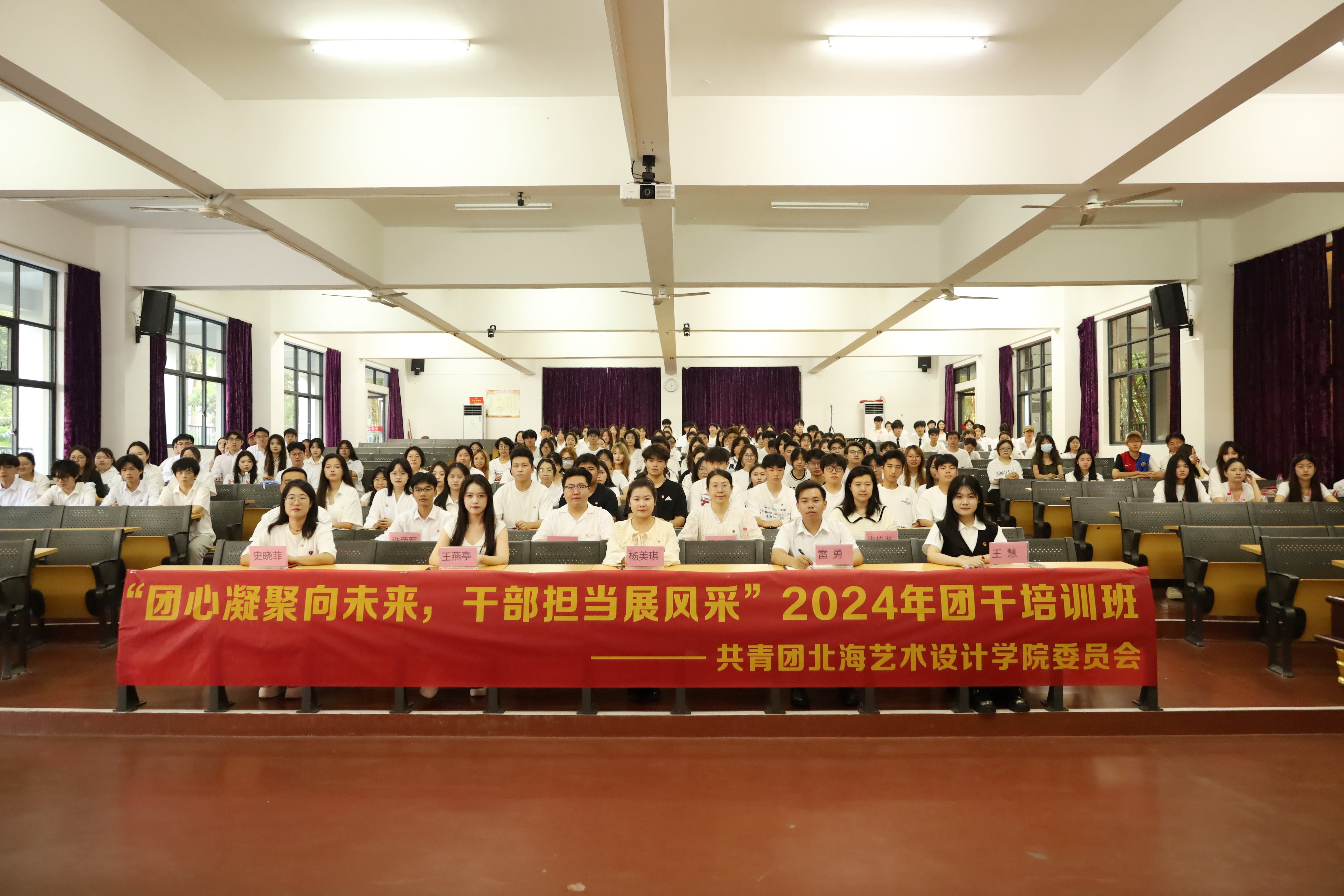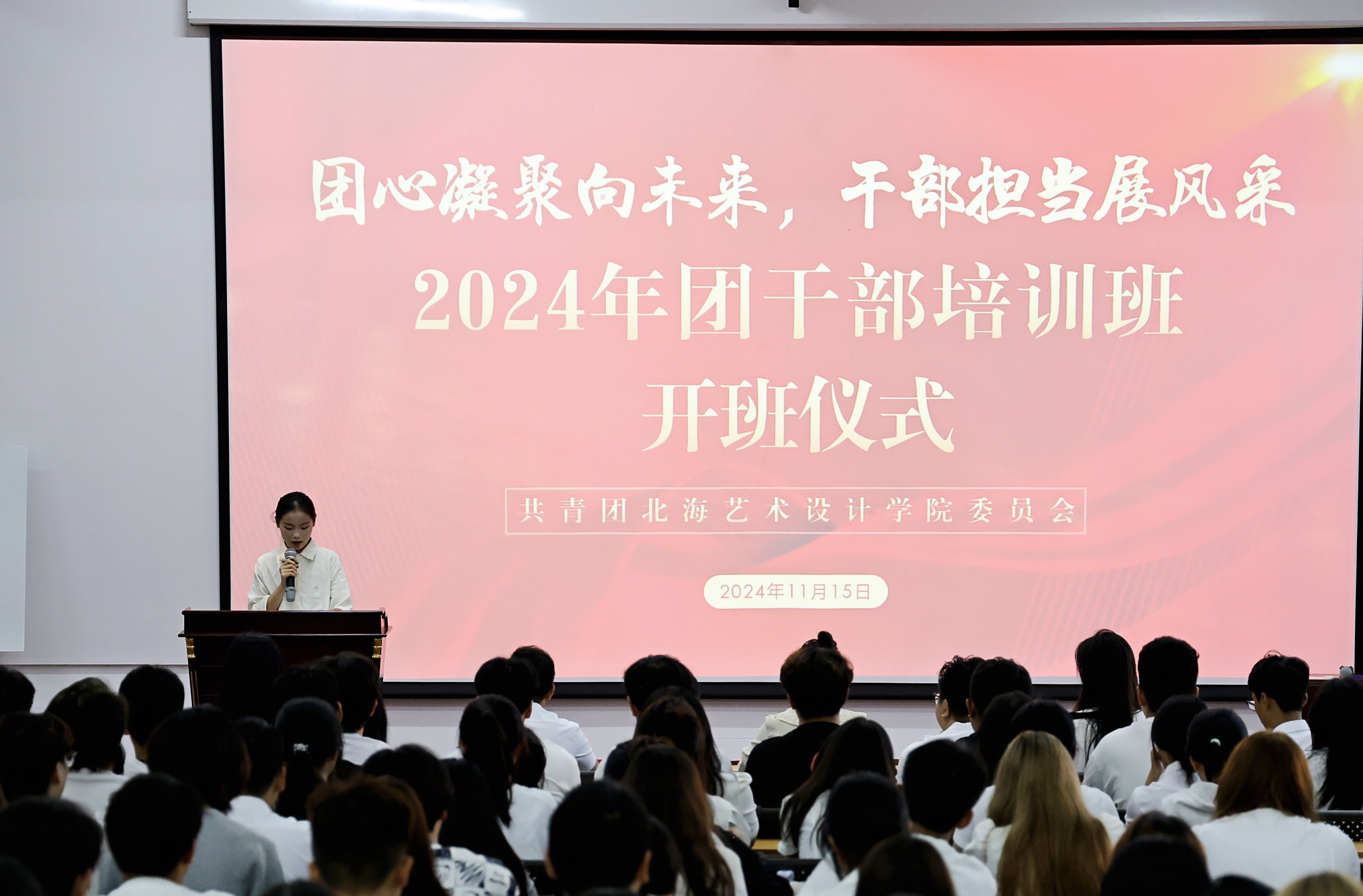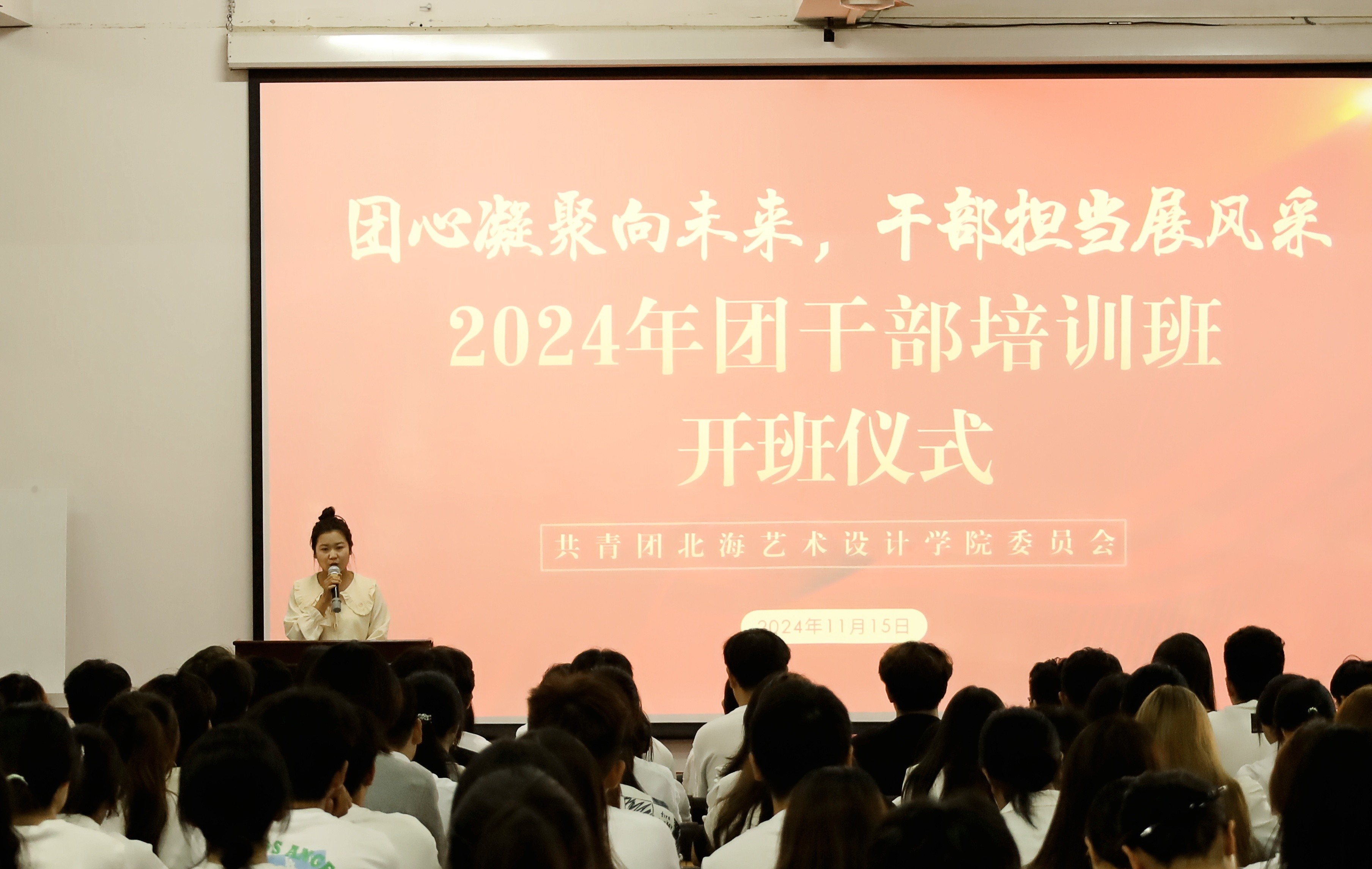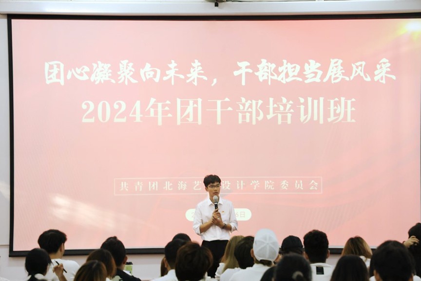 为学习贯彻党的二十大精神,明确本校共青团员干部责任与担当,2024年11月15日至16日,由共青团北海艺术设计学院委员会主办,舞蹈学院分团委、美术学院分团委承办的“团心凝聚向未来,干部担当展风采”24级团干培训班在西区伦理楼107顺利开展。此次会议到场的领导老师有校团委副书记杨美琪、校团委办公室主任雷勇、校团委组织部部长王燕亭、设计艺术学院分团委书记王慧、舞蹈学院分团委书记史晓菲、美术学院分团委书记许荣军、文学院分团委书记马有泽、建筑与环境艺术学院分团委副书记陈宣辰、动画与传媒学院分团委指导老师张依淋。由王诗涵担任主持人,进行了开班的五项议程。