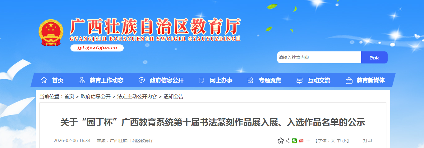 “园丁杯”广西教育系统第十届书法篆刻作品展是由广西壮族自治区教育厅主办的全区性大型书法篆刻赛事展览,参赛对象覆盖全区各级教育行政部门干部职工、各中小学及高校教职员工与在校学生。近日,该展览评选结果正式揭晓,书法学院师生共计21人凭借扎实的专业功底脱颖而出。其中,李雪宁、张儒耀、周鑫鹏3名同学作品入展;宁梦宇、江威龙、柳涵懿3位专业教师,以及王佳一、任建宁等15名学生作品入选。