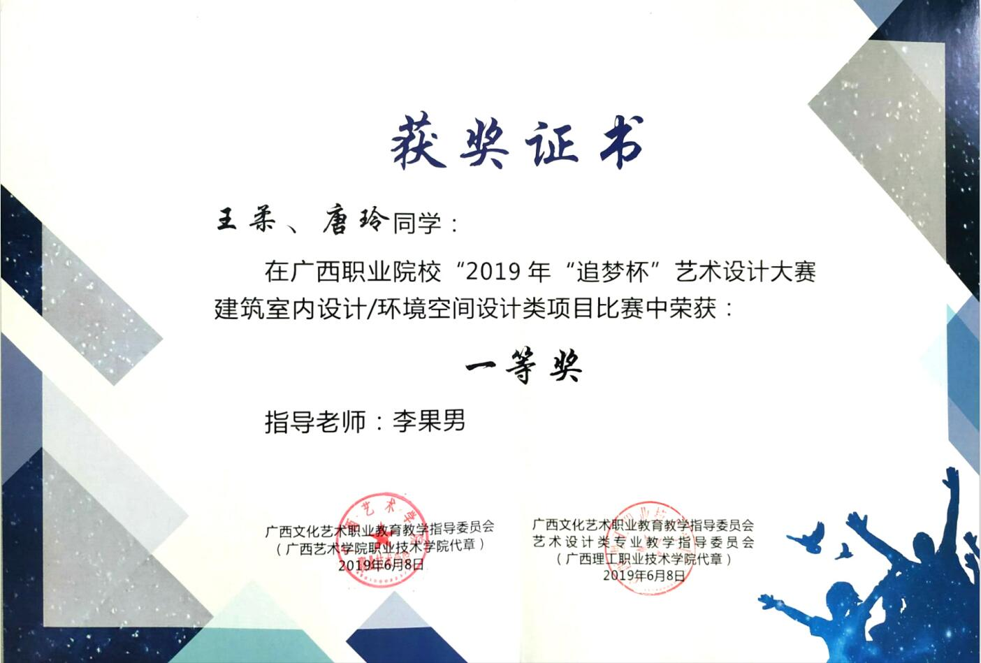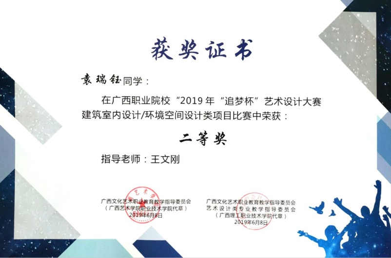 本次大赛是广西文化艺术职业教育教学指导委员会主办,为了推进职业院校创新创业教育、激发创新设计热情、搭建 各委员单位纵深交流平台、提升学生就业质量、推动各委员单位相关设计专业的人才培养质量,进一步检验设计专业的教育教学成果。由广西文化艺术职业教育教学指导委员会艺术设计类专业教学指导委员会牵头举办 2019 年“追梦杯”艺术设计大赛。大赛主题:用“追梦”主导设计的创意思路,用创意火花引燃大家心中的中国梦。