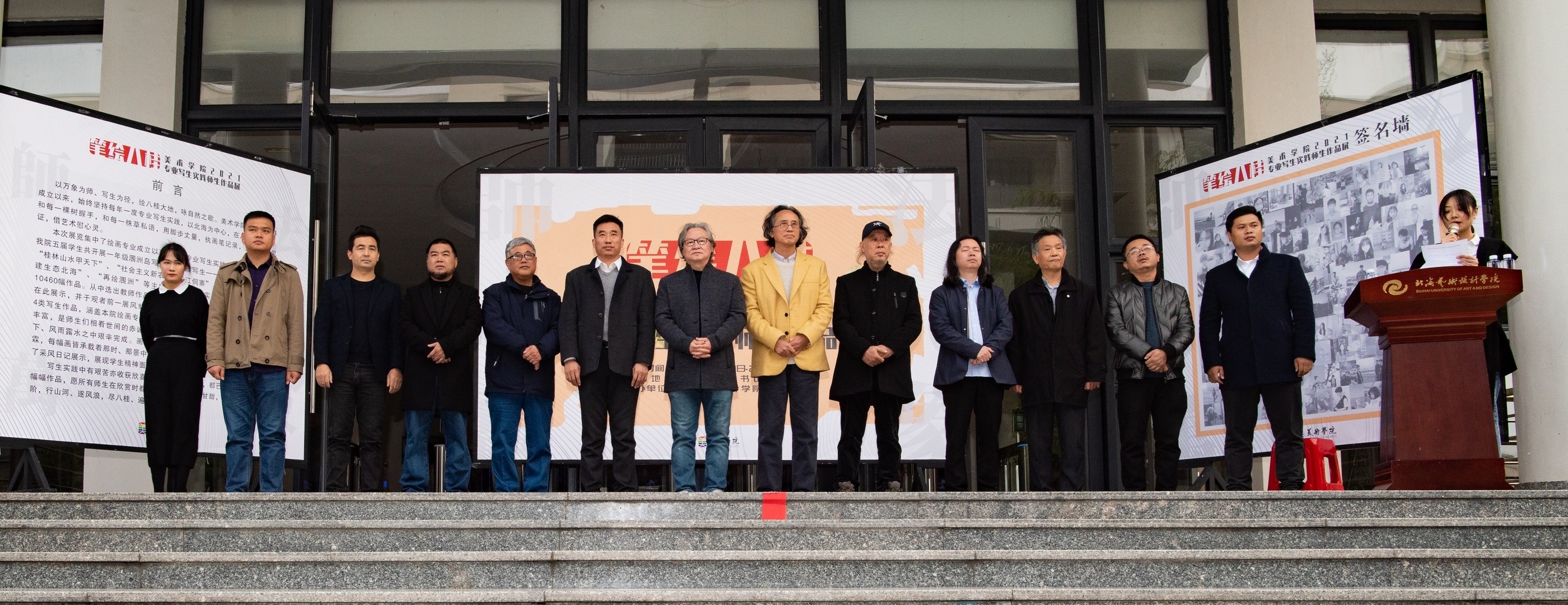 2021年12月31日下午4:30,美术学院于西校区图书馆一楼展厅举行美术学院“笔绘八桂”——美术学院绘画专业写生实践师生作品展。本次展览出席的嘉宾有北海艺术设计学院校长卢新华,北海艺术设计学院副校长胡胜,北海艺术设计学院副校长陶立阳,北海市美术家协会主席、北海艺术设计学院特聘教授肖畅恒,北海市画院院长、北海艺术设计学院特聘教授蔡群徽,北海艺术设计学院美术学院潘毅群教授、巫维轩教授,北海艺术设计学院动画学院党总支书记孙永辉,北海艺术设计学院美术学院党总支书记韩玮,北海艺术设计学院美术学院副院长龚为,北海艺术设计学院美术学院绘画教研室主任张湘中,北海艺术设计学院美术学院综合办主任、专业写生系列课程负责人肖玺,以及美术学院绘画专业部分师生。美术学院郭珂老师主持本次汇报展,肖玺老师以及优秀学生代表徐进以及卢新华校长先后分别进行了发言。