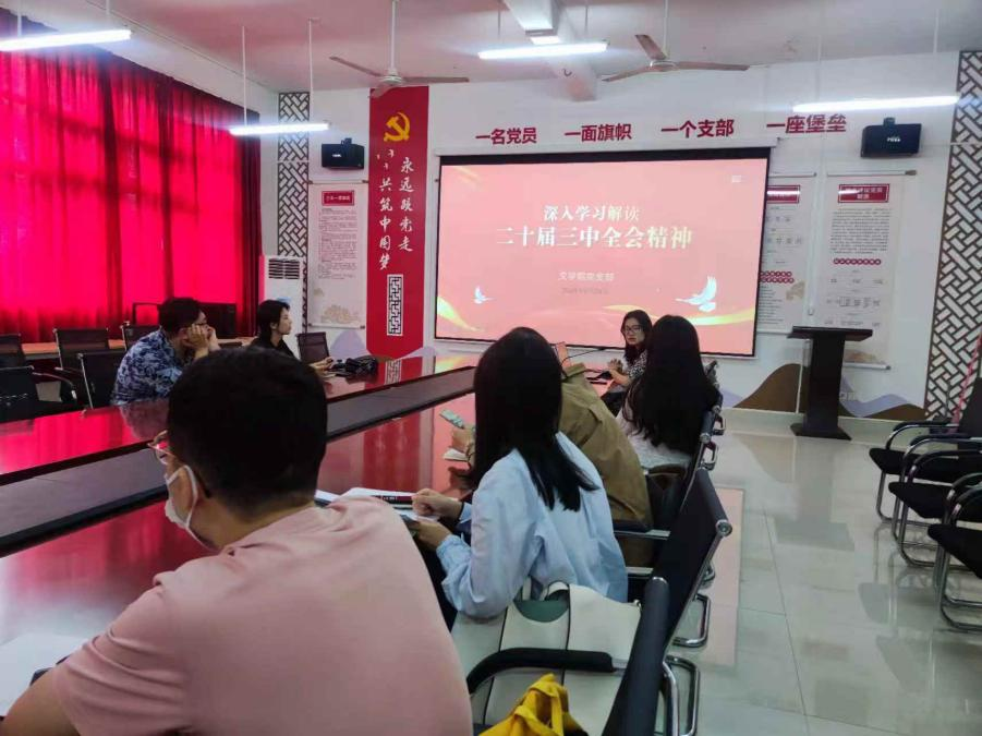 为深入学习贯彻党的二十届三中全会精神9月23日,文学院党支部于公德楼204开展了党的二十届三中全会精神专题党课学习。此次党课学习主要由支部书记岳莹讲授,学院全体党员参与。