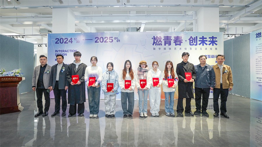 此次展览共评选出一等奖2组、二等奖6组、三等奖8组。获奖作品主题涵盖了非遗文化、老龄化、艺术疗愈等多个领域,充分展示了学生在数字媒体艺术方面的创新能力和实践成果。在充满激情和热烈的氛围中,出席领导、嘉宾现场为获奖学生颁发了荣誉证书。