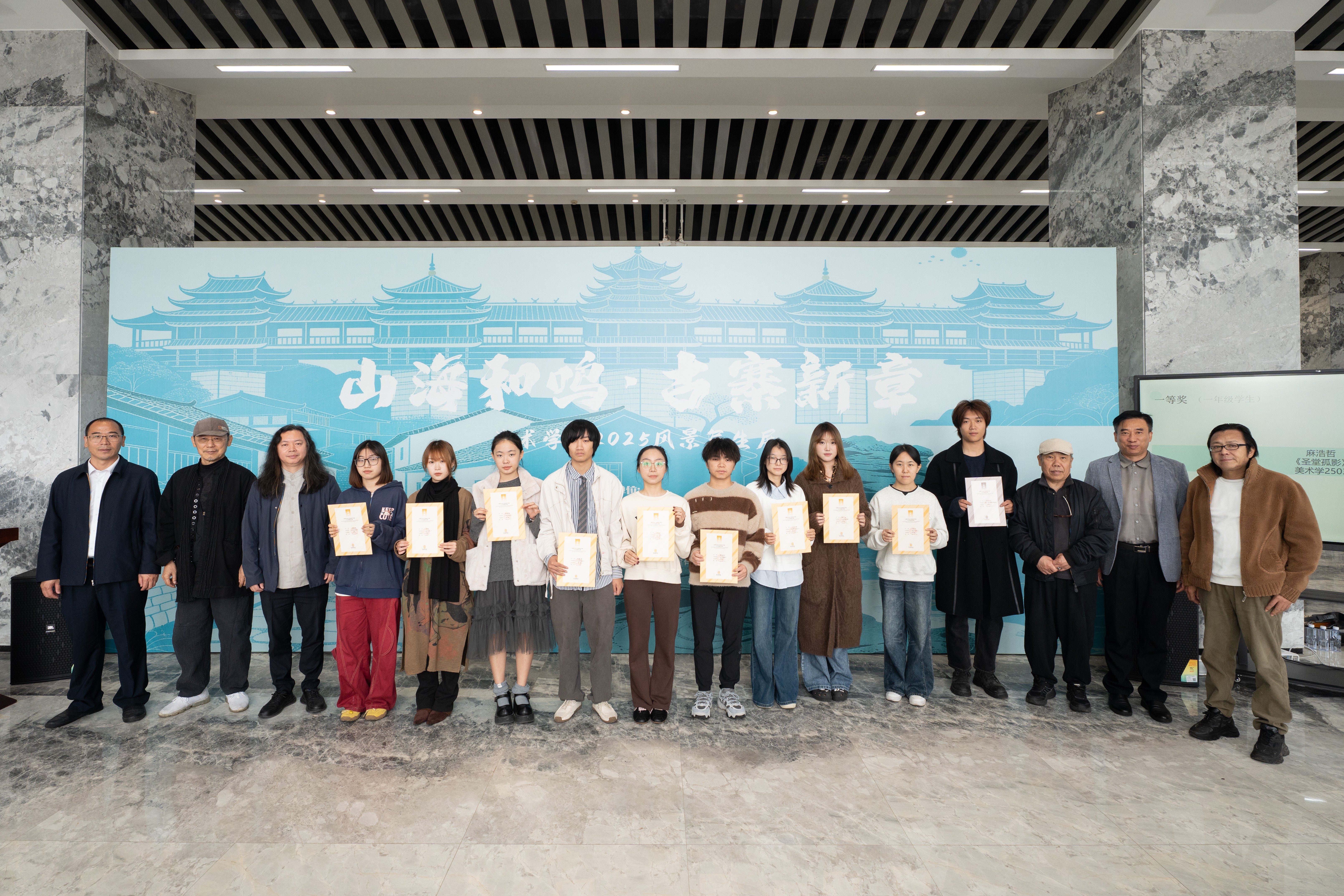为鼓励学生创作,在展览开幕前夕,美术学院成立了评委会并进行严格的评审会议和评审流程,共遴选出一等奖10人、二等奖20人、三等奖30人。现场领导及嘉宾为获奖学生现场颁发获奖证书。