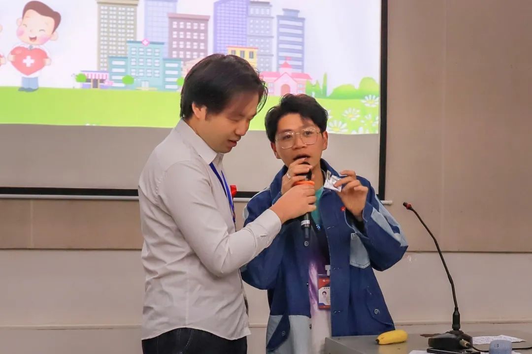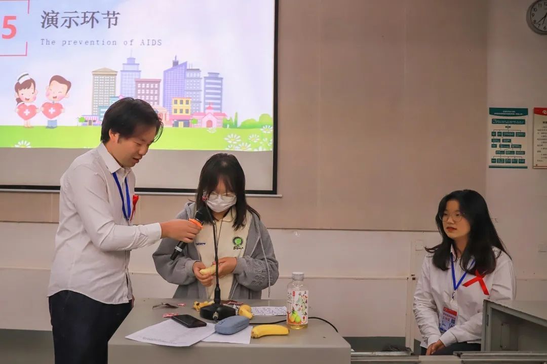 与此同时,主持人邀请到了学长为我们现场演示如何正确使用避孕套并提醒大家在使用过程中需要注意的相关事项。